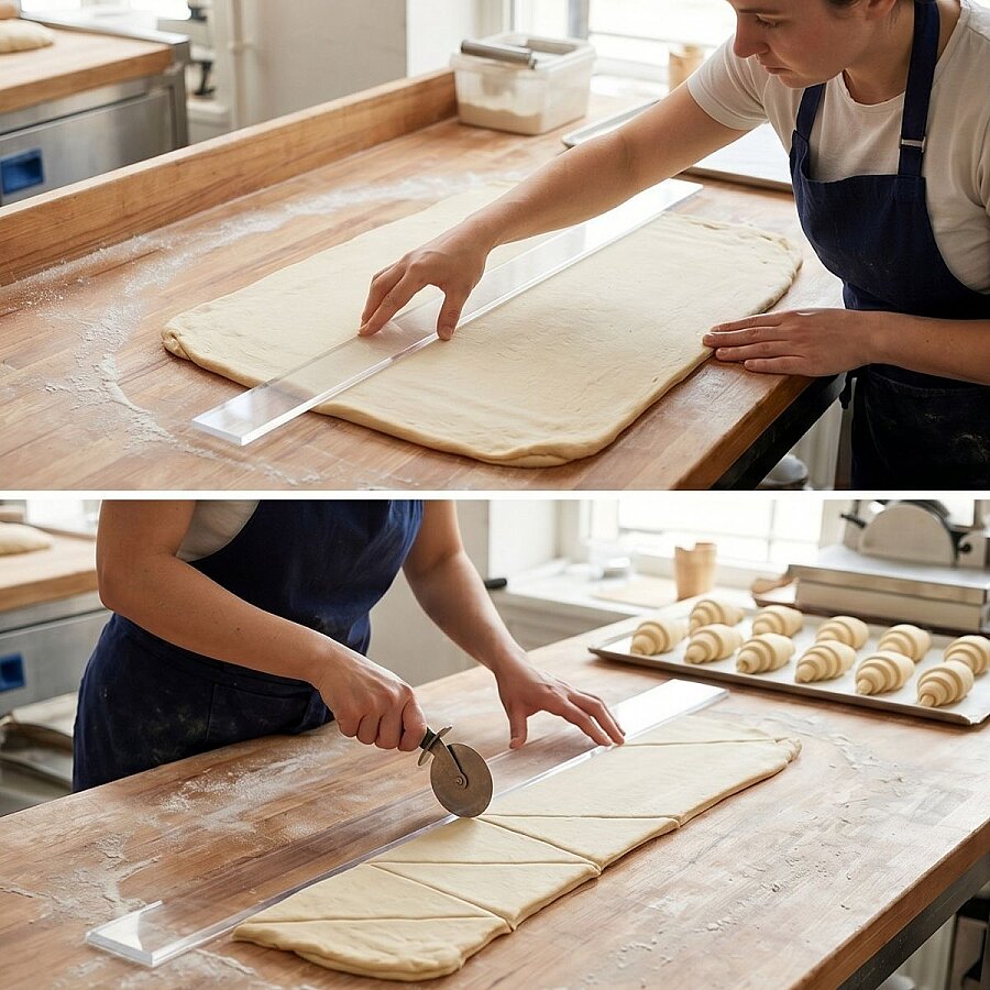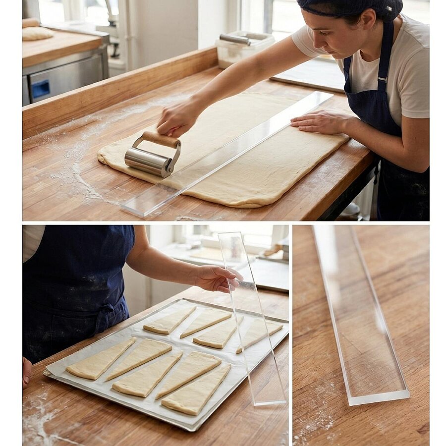 Açıklama: Kruvasan, danish ve milföy gibi katmanlı hamurların üretiminde standartizasyon sağlamak için özel olarak tasarlanmıştır. 60 cm uzunluğu ve 4 cm ideal en genişliği ile hamur kesim işlemlerinde bıçak veya rulet için pürüzsüz bir kılavuzluk sunar. Üzerinde ölçü birimi bulunmaması, dikkat dağıtmadan sadece fiziksel bir sınır ve dayanak olarak kullanılmasını sağlar. Şeffaf pleksi yapısı sayesinde hamurun altındaki dokuyu görmenize imkan tanıyarak hatasız kesim yapmanızı kolaylaştırır.