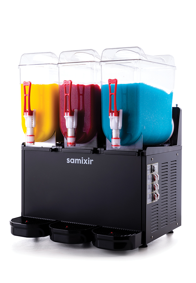 SLUSH Triple Slush granita ve meyve suyu dispenseri Slush, granita, buzlu kahve, buzlu kapuçino, benzeri buzlu içeceklerin üretimi ve dağıtımı için tasarlanmış tezgah üstü dispenser.  Ürün karışımının şeker oranı % 12 ile % 17 arasında olmalıdır. Soğuk meyve dispenseri olarak da kullanıma uygundur. Hazneler soğutma ve karıştırma konularında birbirlerinden bağımsız kontrol edilebilir, çoklu hazne sayesinde her an içecek temini sağlanabilir. Çok düşük enerji tüketimli gece modu sayesinde hazne içindeki buzlu içecek sorunsuz olarak gece depolanır. Polikarbonat hazne darbeye dayanıklı ve gıda kullanımına uygundur. Makinenin kompakt gövdesi ve çoklu hazne özelliği sayesinde tüm işletmeler için uygun çözümdür. Ağırlık ve Ölçüler Makine Koli Ağırlık 58,3 kg 62 kg Genişlik 590 mm 630 mm Derinlik 530 mm 530 mm Yükseklik 770 mm 805 mm *damlalık dahil Teknik Detaylar Kapasite 36 Litre ( 3 x 12 L ) Defrost Modu Mekanik Soğutucu Gaz R404A / R290 Soğutma Gücü 1400W Güç 1050W Akım 3,72A Besleme Voltajı 220-240 V 50 Hz