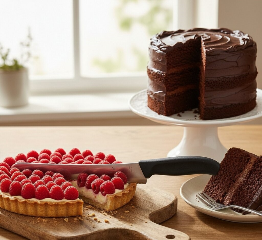 Klasik Pasta Bıçağına benzer bir görünüm ve his veren bu pratik versiyon, kekleri kremalamak ve süslemek için yuvarlak uçlu 22 cm uzunluğundaki kavisli bir bıçağa ve ayrıca hamur işleri, kekler ve ekmekleri zahmetsizce kesmek ve testereli bir kenara sahiptir.