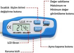 CEM DT-131 saplama problu gıda termometresi cihazı ile batırdığınız gıdaların veya sıvıların sıcaklığını kolay bir şekilde ölçebilirsiniz. Cihazın probu 12 cm uzunluğunda ve paslanmaz çelik yapıdan oluşmaktadır. Ölçülen sıcaklık değerlerini görüntülenebilmesi için cihaz, 1 cm yüksekliğinde ve 2.5 cm genişliğinde LCD ekrana sahiptir. CEM DT-131 problu termometre cihazında bulunan HOLD butonu ile ölçtüğünüz sıcaklık değerini ekranda sabitleyebilir, maksimum ve minimum sıcaklık değerlerini görüntüleyebilirsiniz. Cihaz, mavi renkli ve yumuşak yapıdan oluşan silikon koruma kılıfına sahiptir. Bu koruma kılıfı ile cihaz hem elinizden kolay kolay kaymaz hem de ufak darbelerde cihazı korur. CEM DT-131 saplama problu gıda termometresi cihazında bulunan "°C/ °F" tuşu ile sıcaklık birimleri arasında geçiş yapabilirsiniz. Cihaz üzerinde bulunan "ON/ OFF" tuşu ile cihazı manuel olarak açıp kapatabilirsiniz. Cihaz ile bir süre işlem yapmadığınız zaman, cihaz kendisini otomatik olarak kapatır. Böylece enerji tasarrufu yapmış olursunuz. Cem DT-131 saplama problu sıcaklık ölçer cihazı 1 adet LR44 pil ile çalışmaktadır.