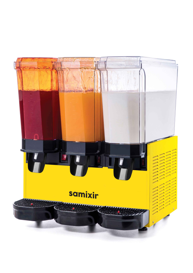 TRIPLE Meyve suları, limonata, şerbet, süt, kahve, ayran, çay gibi soğuk içeceklerin soğutulması ve dağıtımı için tasarlanmış tezgah üstü dispenser  Fıskiyeli: Parçacıksız meyve suları ve şalgam gibi içeceklerin soğutulması ve dağıtımı için manyetik fıskiye sistemiyle tasarlanmıştı Karıştırıcılı: Parçacıklı meyve suları, şalgam, soğuk kahve ve çay gibi içeceklerin soğutulması ve dağıtımı için manyetik paletli, yavaş karıştırma sistemiyle tasarlanmıştır. Sızıntı Önleme: Fıskiyeli modelde manyetik pompa, karıştırıcılı modelde manyetik palet sistemi, içeceğin motor bölümüne sızmasını önler, motor ömrünü uzatır. Fıskiyeli Model: Parçacıklı içeceklere uygun değildir. Karıştırıcılı Model: Burgulu palet sistemi homojen karışım ve hızlı soğutma sağlar. Hazneler bağımsız kontrol edilebilir. Pratik Musluk: Tek elle kolayca içecek alımını sağlar. Geniş musluk hortumu hızlı dolum ve kolay temizlik sunar. Temizlik ve Hijyen: Tüm içecekle temas eden parçalar kolayca temizlenir. Dayanıklı Hazne: Polikarbonat hazne darbeye dayanıklıdır ve gıda kullanımına uygundur. Kompakt Gövde: Yüksek günlük tüketimi olan tesisler için idealdir. Seviye Göstergesi: Damlalıktaki seviye göstergesi, taşmadan önce boşaltmayı hatırlatır. Sıcaklık Ayarı: Gövde içinden manuel olarak ayarlanır, termostatla sabit tutulur. Ağırlık ve Ölçüler Makine Koli Ağırlık 42,3 kg 44,5 kg Genişlik 545 mm 575 mm Derinlik 525 mm 550 mm Yükseklik 665 mm 690 mm *damlalık dahil Teknik Detaylar Kapasite 60 Litre ( 3 x 20 L ) Soğutucu Gaz R134A / R290 Sıcaklık Aralığı +5˚C... +10 ˚C Soğutma Gücü 1020W Güç 340W Akım 1,75 A Besleme Voltajı 220-240 V 50 Hz