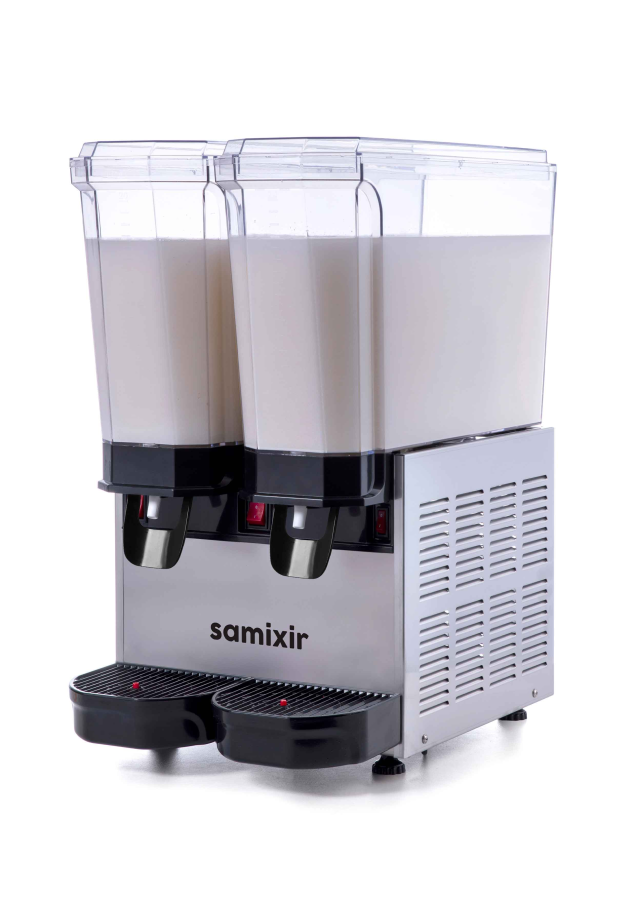 TWIN klasik fıskiyeli karıştırıcılı soğuk içecek dispenseri Doğal meyve suları, ayran ve her türlü soğuk içeceklerin soğutulması ve dağıtımı için tasarlanmış tezgah üstü dispenser  Fıskiyeli manyetik fıskiyeli karıştırma sistemi sayesinde; özellikle parçacıksız meyve suları, şalgam suyu gibi soğuk içeceklerin soğutulması ve dağıtımı için tasarlanmış tezgah üstü dispenser. Karıştırıcılı manyetik paletli, yavaş çalışan karıştırma sistemi sayesinde; özellikle parçacıklı meyve suları, ayrıca; şalgam, soğuk kahve, soğuk çay, gibi soğuk içeceklerin soğutulması ve dağıtımı için tasarlamış tezgah üstü dispenser. Fıskiyeli modelde manyetik pompa ve Karıştırıcılı modelde manyetik palet sistemi sayesinde hazne içinde bulunan içeceğin alt motor bölümüne sızma riski ortadan kalkar, bu sayede motor ömrü uzar. Fıskiyeli modeller parçacıklı içeceklere uygun değildir. Karıştırıcılı; Burgulu palet sistemi homojen bir karışım ile içeceğin daha hızlı soğumasını sağlar. Hazneler soğutma ve karıştırma konularında birbirlerinden bağımsız kontrol edilebilir, çoklu hazne sayesinde her an içecek temini sağlanabilir. Pratik musluk sistemi; tek el kullanılarak rahatça içecek alabilmeyi sağlar. Geniş musluk hortumu devamlı akışkanlık sağlar ve kolaylıkla sökülüp temizlenebilir. Mükemmel temizlik ve hijyen için içecekle temas eden tüm parçalara kolayca ulaşılır ve hızlı bir şekilde temizlenebilir. Polikarbonat hazne darbeye dayanıklı ve gıda kullanımına uygundur. Kompakt gövdesi sayesinde yüksek miktarda günlük tüketime sahip tesislerin ihtiyaçlarını karşılar. Damlalıkta bulunan seviye göstergesi sayesinde atık suyun taşmadan önce boşaltılması gerektiği rahatça fark edilir. Sıcaklık seviyesi manuel olarak gövde içinden ayarlanır, termostat bu ayarı korur. Ağırlık ve Ölçüler Makine Koli Ağırlık 32,5 kg 34,4 kg Genişlik 365 mm 395 mm Derinlik 525 mm 535 mm Yükseklik 665 mm 690 mm *damlalık dahil Teknik Detaylar Kapasite 40 Litre ( 2 x 20 L ) Soğutucu Gaz R134A / R290 Sıcaklık Aralığı +5˚C... +10 ˚C Soğutma Gücü 750W Güç 310W Akım 1,55 A Besleme Voltajı 220-240 V 50 Hz
