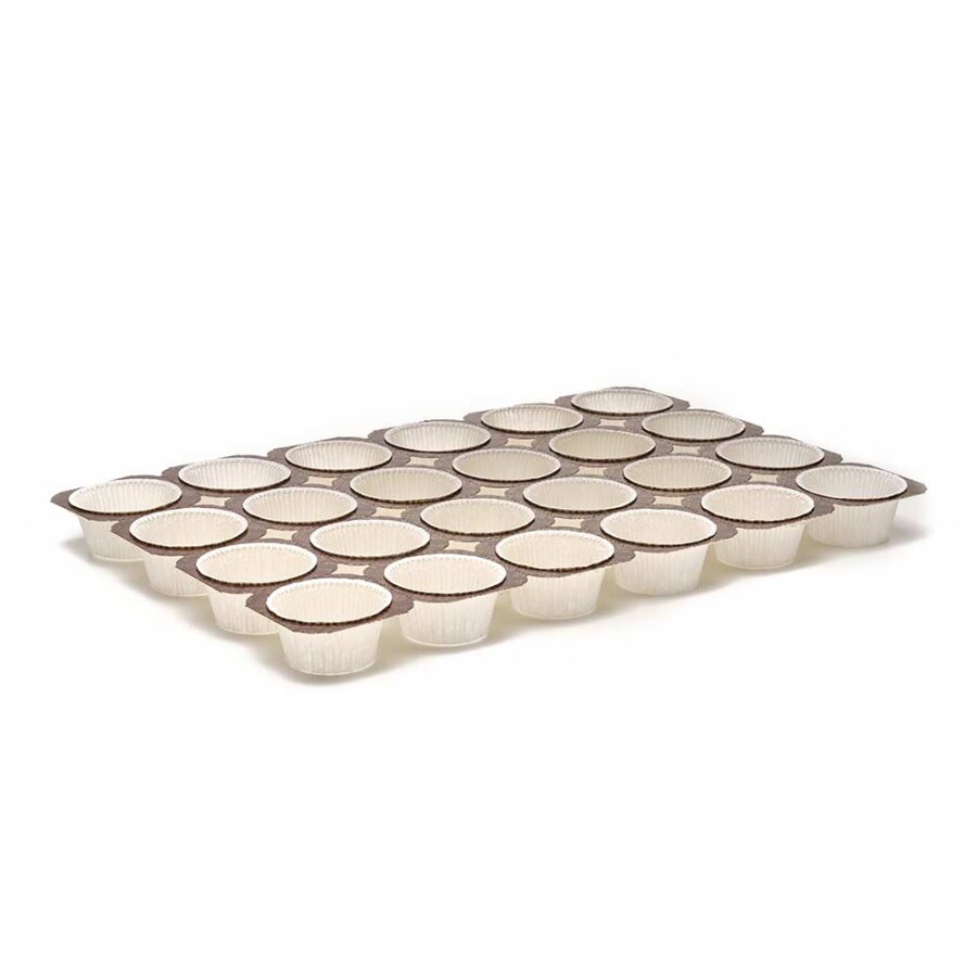 24 kağıt kap içeren kahverengi kartondan yapılmıştır, gıda yağlarına dayanıklıdır ve hem dondurulmaya hem de 200°C'ye kadar fırınlanmaya dayanıklıdır. Bu tepsi, özel kendinden destekli yapısı sayesinde önceden hazırlanmış kalıplara yerleştirilmesine gerek kalmaz. Zarif tasarımı, bitmiş ürünün sunumu için uygundur.